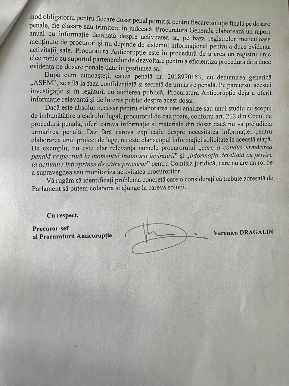 Anexez răspunsul primit de la Procuratura Anticorupție. Nefericit. Înțeleg că Parchetul Anticorupție nu vede o problemă în încălcarea ordinului interinstituțional prin faptul că nu a introdus rechizitoriul în sistem (deoarece acest lucru nu a cauzat niciodată o problemă în cadrul unei anchete penale!!!). Ca să nu mai vorbim de faptul că PA îl va recunoaște ca suspect – ceea ce reprezintă o etapă intermediară. Dar în acest caz este vorba despre acuzație – care este o etapă mult mai serioasă a procesului penal.”
