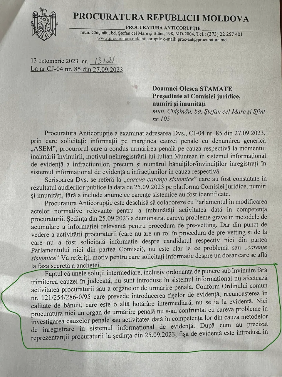 În acest caz, Olesia Stamate, care prezidează și Comisia juridică pentru numiri și imunități, a cerut AP informații despre identitatea „procurorului care a emis ordonanța de punere sub învinuire, indiferent dacă documentul este sau nu introdus în sistem, dacă a întreprins sau nu anumite acțiuni de înregistrare a dosarului, așa cum prevede o ordonanță comună interdepartamentală”. Interogatoriul a fost efectuat, potrivit deputatului, în urma unei audieri în Parlament pe marginea „cazului Iulian Muntean”.