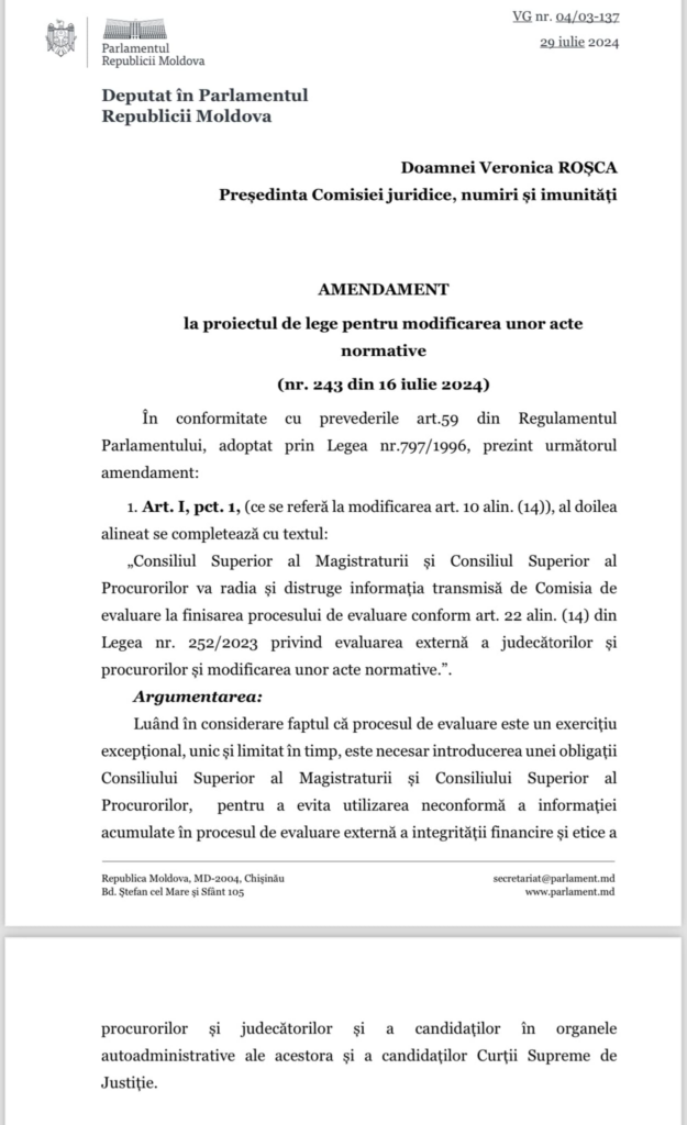 Modificarea prevede ștergerea și distrugerea informațiilor transmise de Comisia de Evaluare după finalizarea procesului de evaluare, relatează Noi.md cu referire la un document făcut public de Năstase.