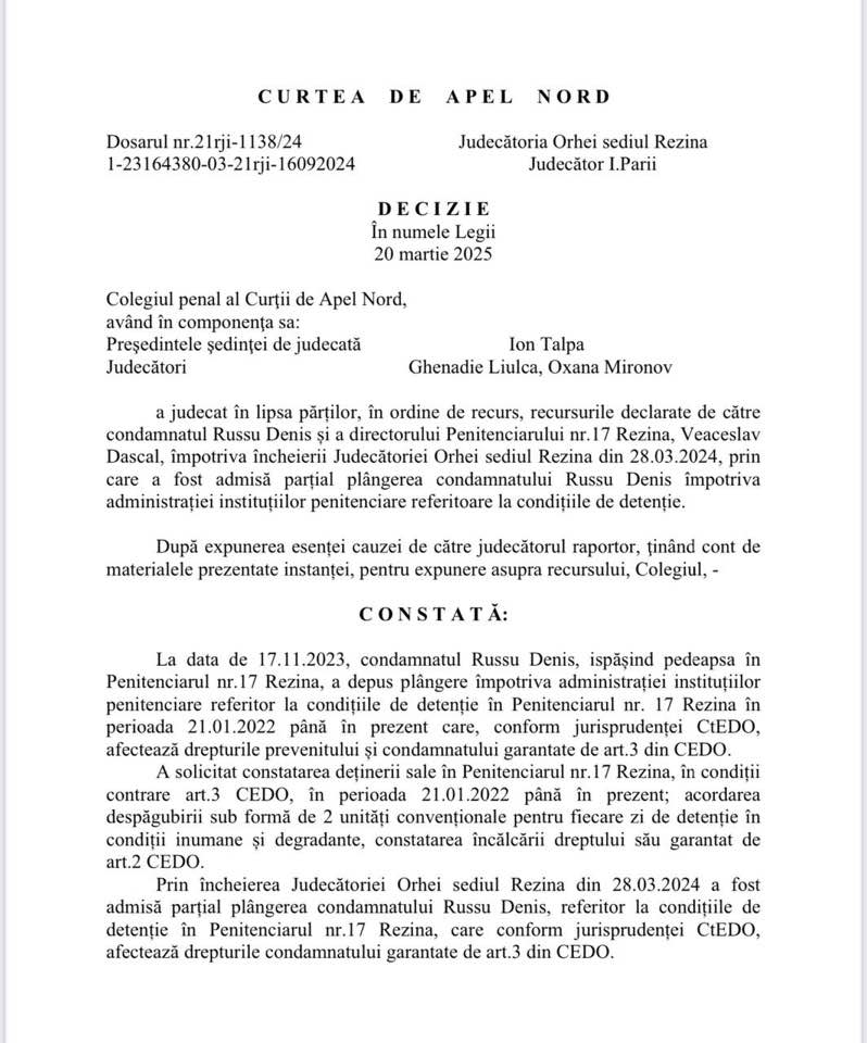 „Prin încheierea Judecătoriei Orhei sediul Rezina din 28.03.2024 a fost admisă parțial plîngerea condamnatului Russu Denis, referitor la condițiile de detenție în Penitenciarul nr.17 Rezina, care conform jurisprudenței CtEDO, afectează drepturile condamnatului garantate de art.3 din CEDO”, se arată în decizia Curții de Apel Nord din 20 martie 2025.