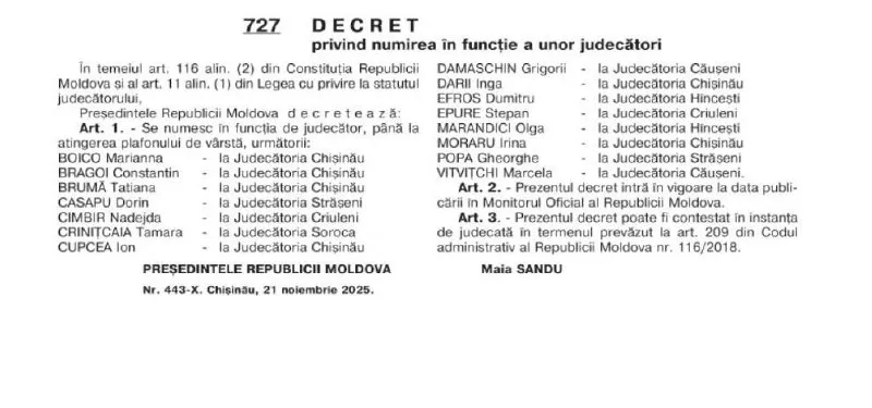 Președinta Republicii Moldova, Maia Sandu, a confirmat numirea în funcție a 15 noi judecători, printr-un decret emis la 21 noiembrie 2025.