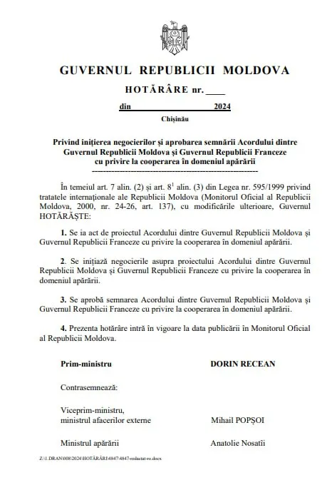 Согласно документу, власти Кишинева должны принять к сведению проект соглашения между правительством Молдовы и Франции, инициировать переговоры и одобрить подписание. Решение вступит в силу с момента его опубликования в Официальном мониторе.